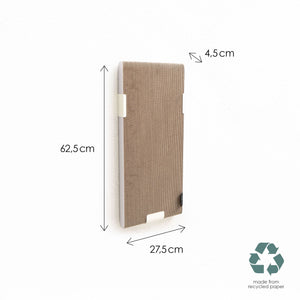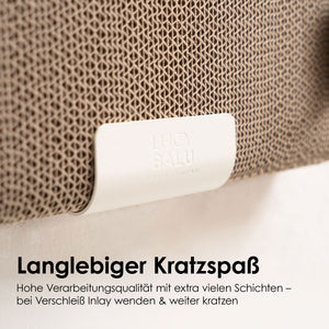 WALLPAPER ist als wandmontiertes Kratzmöbel zur Krallenpflege deiner Katze gedacht. Das Kratzbrett aus Pappe wird einfach in eine an der Wand montierte Metallhalterung geschoben. Die Wellpappe animiert zum kratzen und ist dabei erstaunlich robust. LucyBalu legt hohen Wert auf Nachhaltigkeit. Deswegen ist WALLPAPER auf Langlebigkeit ausgelegt. Das Katzenelement kann doppelt verwendet werden: einfach umdrehen und du hast sofort ein neues Kratzbrett für deine Katze. Bei Verschleiß kannst du das Kratzelement bei uns nachkaufen.