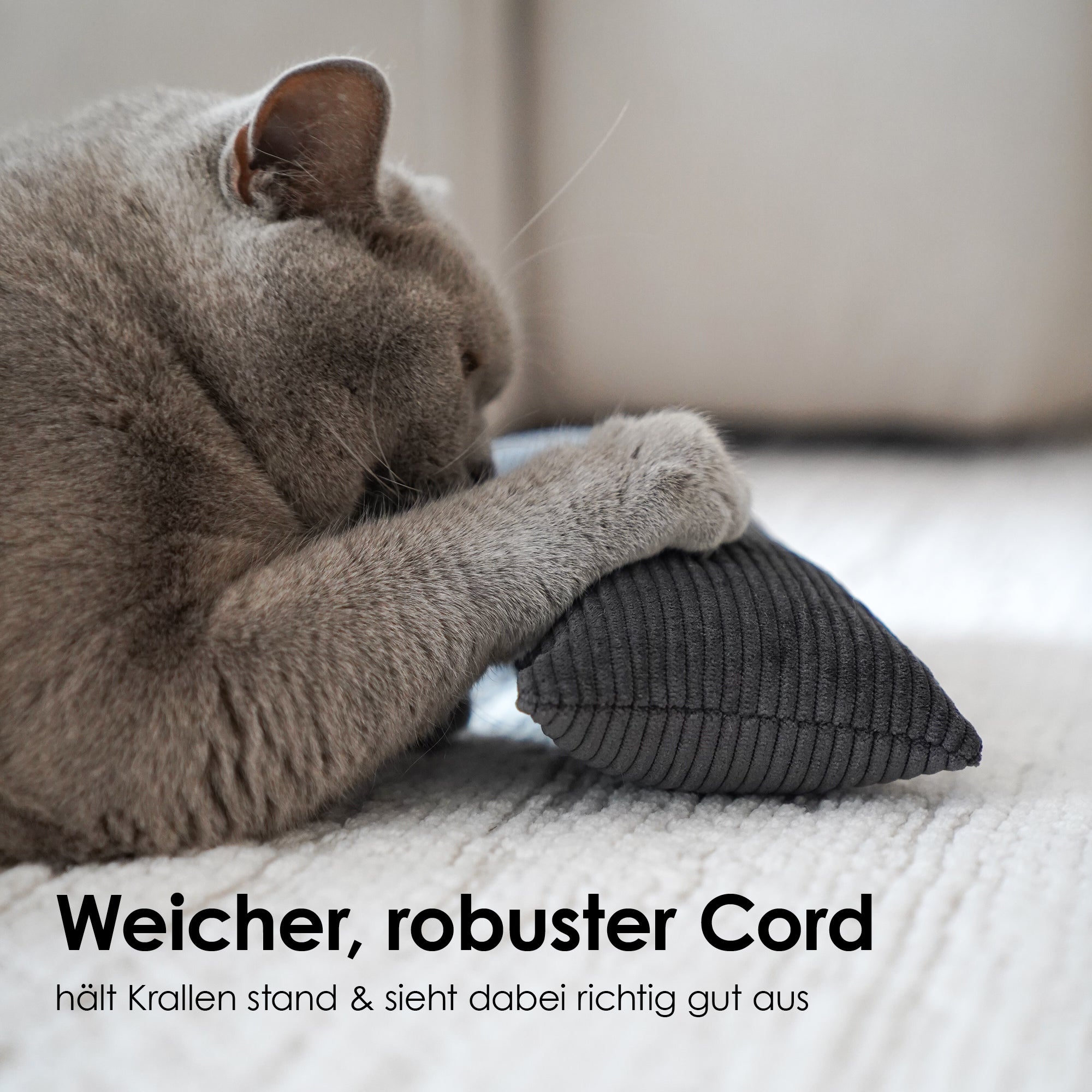 Das KICK BUNNY Katzenkissen mit Katzenminze wurde speziell für sogenannte Bunnykicks entwickelt – diese typischen Tretbewegungen mit den Hinterpfoten, bei denen sich Katzen in ihr Spielzeug „verbeißen“. Die längliche Form liegt gut in den Pfoten, der weiche Cordstoff ist angenehm, aber strapazierfähig. Innen sorgt eine Füllung aus echter Merinowolle und hochwertiger Katzenminze für langanhaltende Motivation und Spieltrieb. Ideal für aktive Katzen, die sich auspowern oder Stress abbauen wollen. Ob als tägliche Spielrunde oder als Anti-Frust-Objekt: KICK BUNNY ist mehr als nur ein Kuschelkissen. Es spricht den natürlichen Jagdinstinkt an und gibt deiner Katze die Möglichkeit, auf katzengerechte Weise Dampf abzulassen. Gleichzeitig sieht es gut aus und passt stilvoll in jedes Zuhause – ganz ohne knallbunte Plastikoptik. Ein ehrliches Spielzeug für moderne Stubentiger.