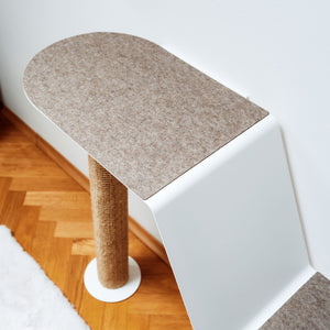 • Weiß: Metallelement in Weiß (RAL 9016). Filzauflage in Sand Melange, Kratzstamm in Natur